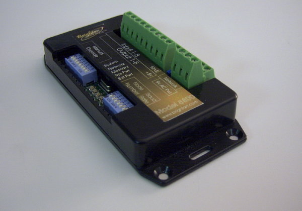This is one of the lighting system modules. All information is stored internally in non-volatile memory. This module can control 8 dimming relays and read 8 switches with a network interface to communicate with other modules.